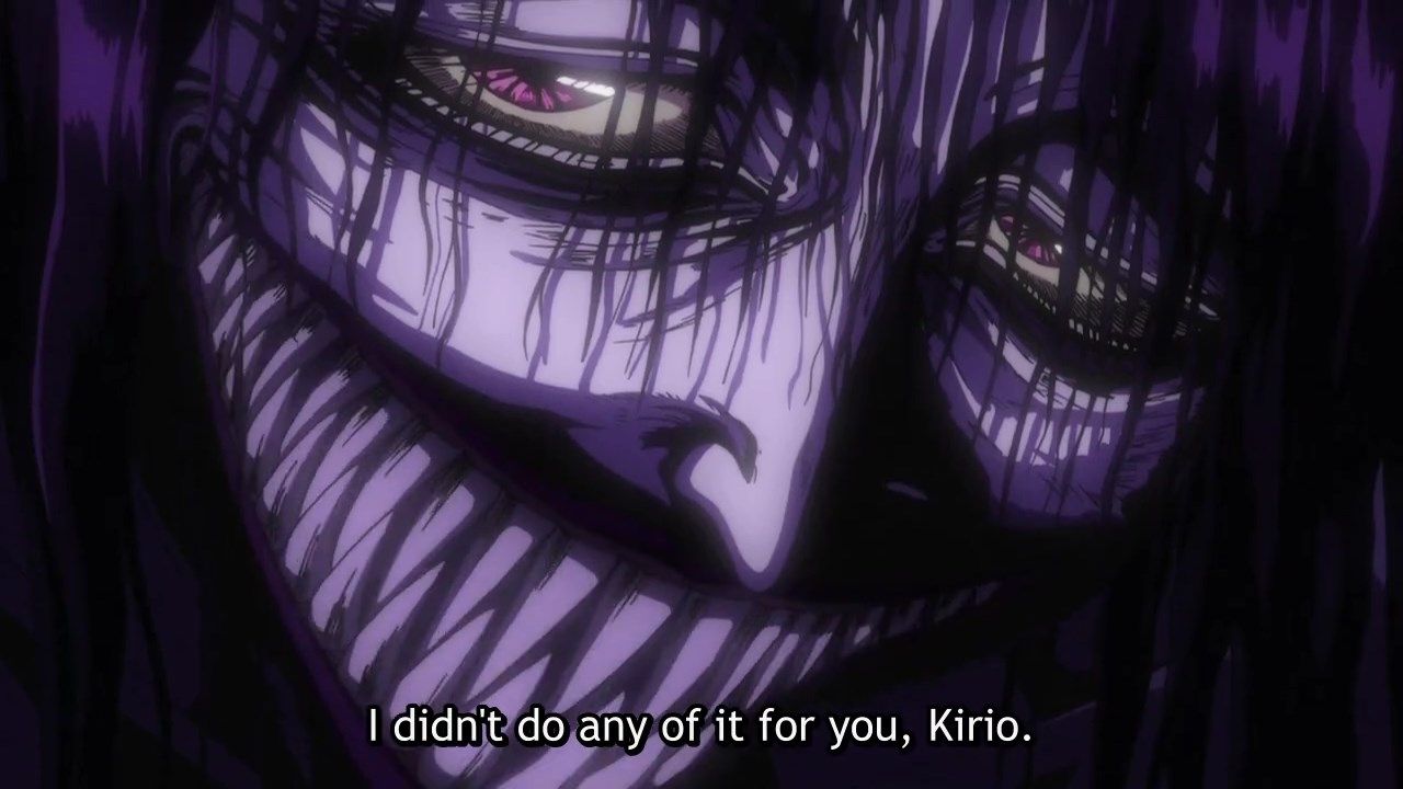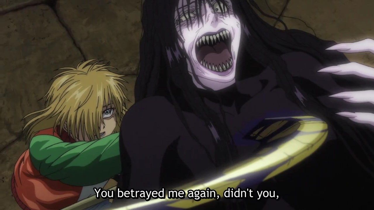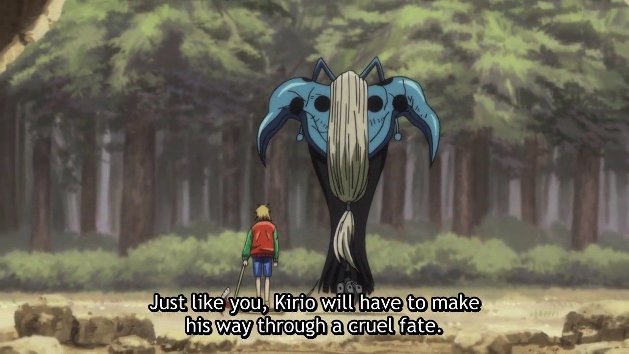 ・分身の方がある意味本体よりも残酷かもしれん。幼子を妖怪と戦わせるマシンとして育て、「母と子」の間で全幅の信頼を得、最後の最後にその心を破壊する。(アニメ的に言えば)5分に3回キリオの心はすり潰された。その一方で、若い坊さん集団を血の海に沈め、獣の槍を完全に封じ込める寸前までいった。なんという純粋悪、悪の見本。