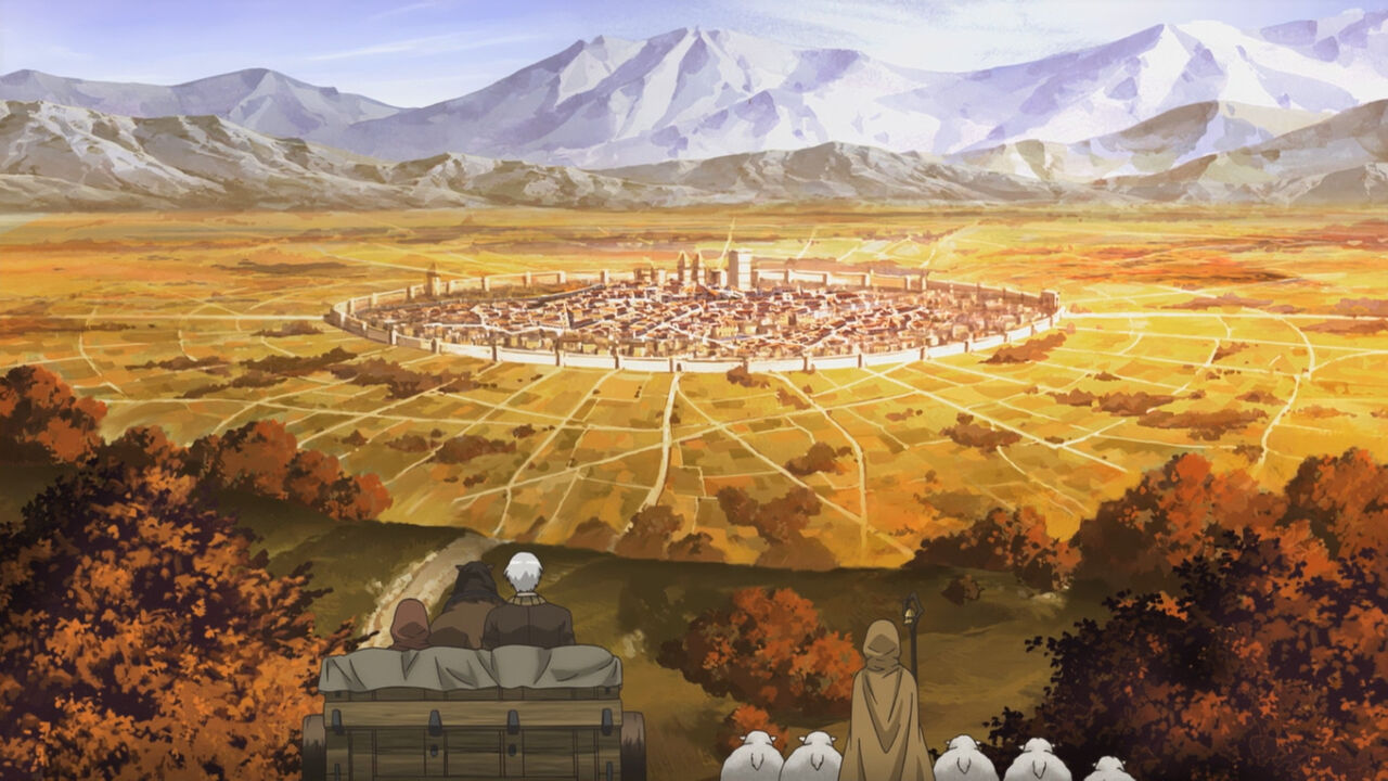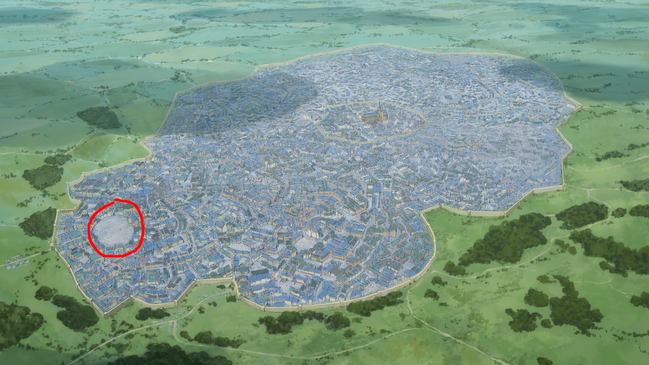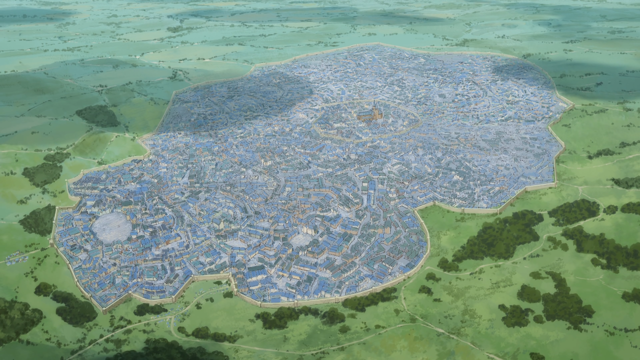 この手の城郭都市を俯瞰する画は中世もの、ファンタジーものの作品だと必ずと言っていいほど登場して